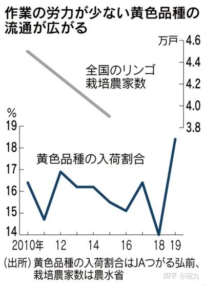 上图:日本全国苹果种植农家数量变化;下图:青森县弘前黄色苹果入荷比例变化。via:nikkei.com