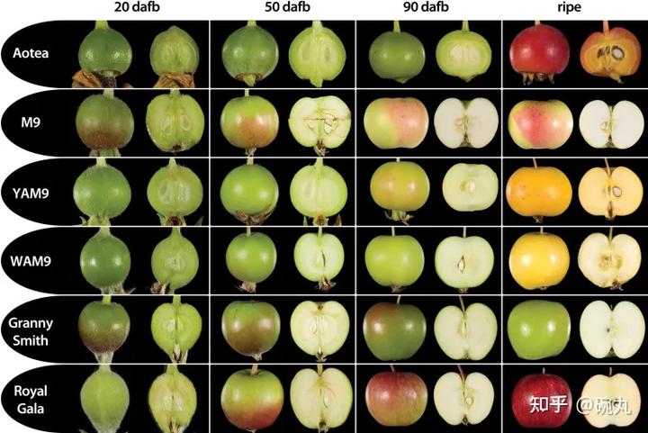 不同苹果成熟过程中的果实颜色变化。via:Metabolic and gene expression analysis of apple (Malus × domestica) carotogenesis