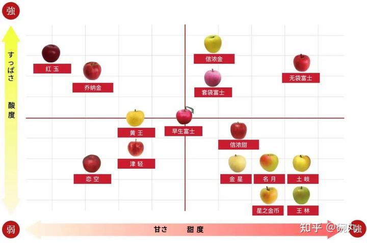 富士系苹果与日本部分其他苹果的风味比较。via:ringosamurai.com,作者翻译。
