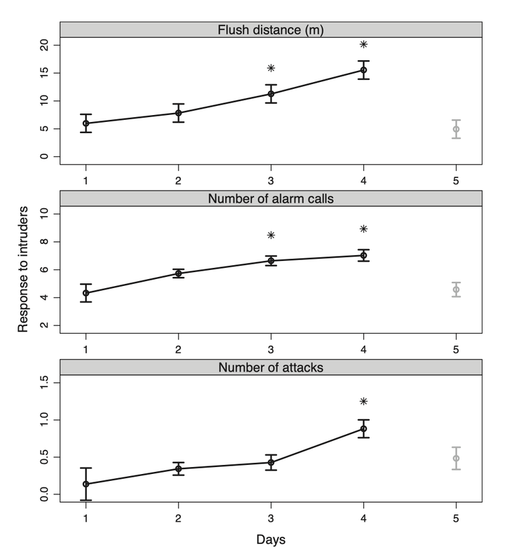 他让同一位研究人员连续四天接近并触碰校园里 24 对嘲鸫的鸟巢,每次仅 15 秒。研究人员每天都换不同的衣服,但嘲鸫对他的攻击性逐日递增。第五天,换了另一个人以完全相同的方式接近鸟巢,嘲鸫立刻回到了第一天的温和状态(见下表)。