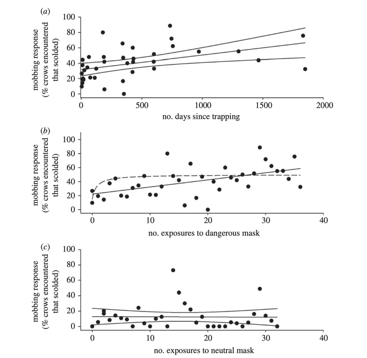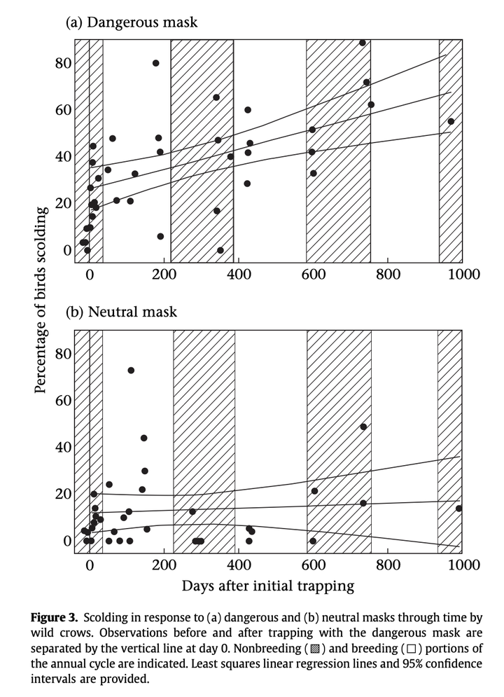 可见野生乌鸦在经历单次诱捕后,对"穴居人"面具的仇视和抗议不仅瞬间飙升,而且在长达近三年的时间里持续不衰 ,而对从未惹过它们的“中性面具”则几乎无动于衷 。