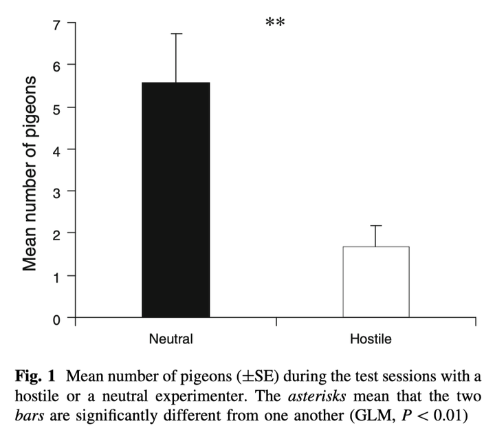 下图可见,在测试阶段,聚集在“中立(Neutral)”投喂者身边的鸽子平均数量显著高于曾驱赶过它们的“敌意(Hostile)”投喂者。