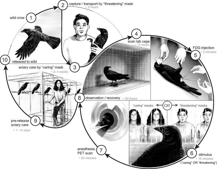 方法本身就值得说一下:以往的动物脑成像研究通常需要先将动物麻醉,但这个团队向清醒状态的乌鸦注射了一种常用的葡萄糖示踪液,液体会涌向大脑中最活跃的区域。然后让乌鸦在笼中自由活动约 15 分钟,期间面对"威胁面孔"或"友好面孔"。
