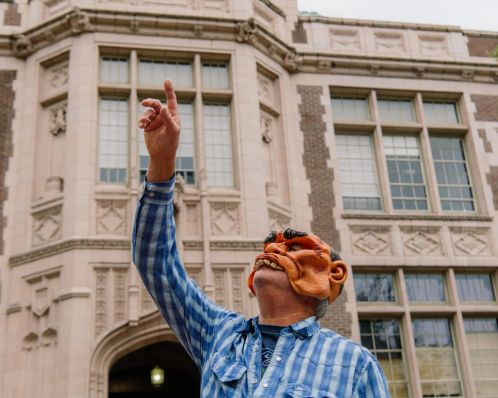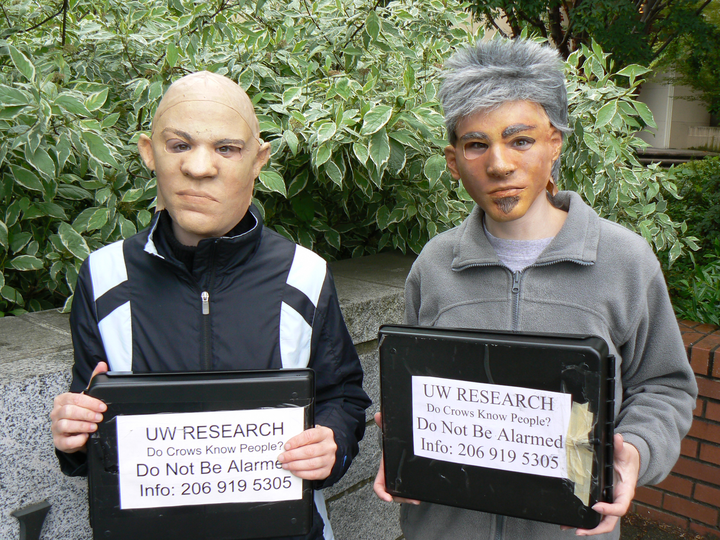 2006 年,华盛顿大学野生动物生物学家约翰·马尔祖夫(John Marzluff),他戴上一副橡胶材质的"穴居人"面具(下图),在西雅图大学校园里用网捕捉了 7 只北美乌鸦(Corvus brachyrhynchos),做了环志标记后放飞。