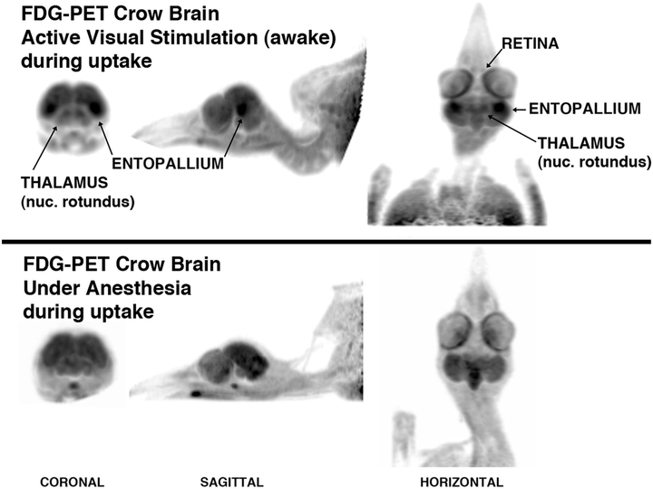 2012 年,马尔祖夫团队更进一步,用正电子发射断层扫描(PET,一种通过检测脑内代谢活动来成像的技术)扫描了活体乌鸦的大脑[4]