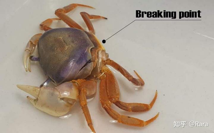 然后处于这个阶段的螃蟹为了蜕壳会吨吨吨大量摄入水分,使体内细胞和组织膨胀,体液增加。目的就是给后续撑裂坚硬的旧壳提供液压动力。达到临界值之后,旧壳上位于螃蟹背甲后部的断裂点处就会破裂。
