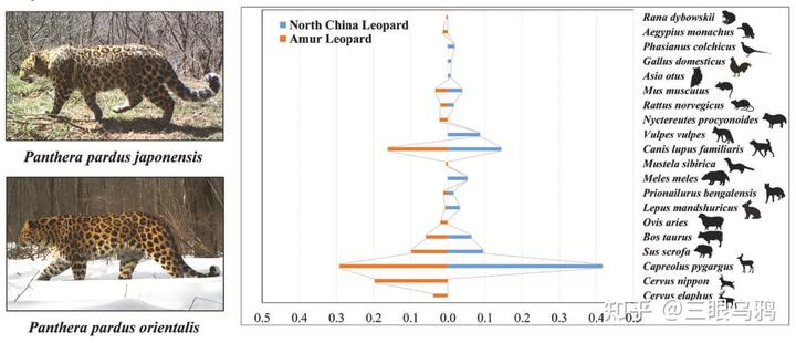 不同的是,东北豹额外从马鹿 *(仅约 3%)和梅花鹿(高达 19.75%)等较大型有蹄类中获取显著生物量。