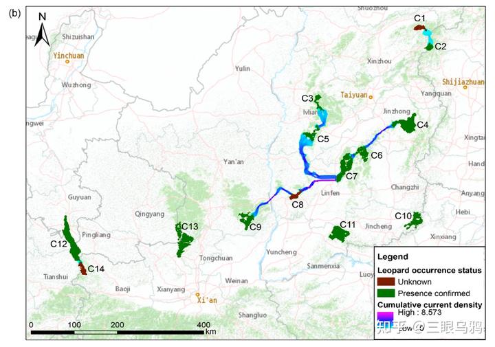 华北地区当前对豹适宜的栖息地总面积仅约 8679km²,且呈高度破碎化格局,被识别为 14 个相对独立的核心斑块,其中仅约 25%被自然保护地覆盖。