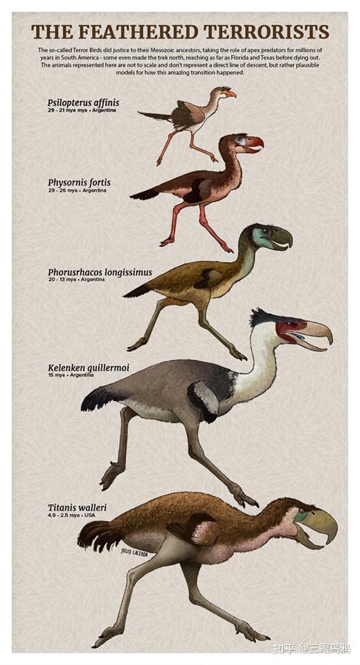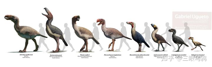 随着时间推移,这些早期小型猎手逐渐分化,中型种类如安达尔加鸟(Andalgalornis)和巴塔哥尼亚鸟(Patagornis)出现在渐新世和中新世,身高可达一米半到两米。