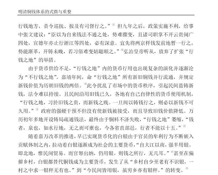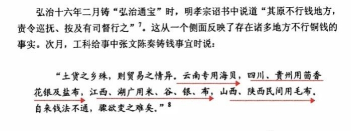 而且明朝铜钱不仅铸造量少,流通范围也很有限,所谓的“行钱之地”只有北直隶、山东、南直隶、浙江北部与河南东部,在小额交易中习惯使用铜钱。除此之外都是“不行钱之地”,小额交易使用碎银子或者以货易货。例如云南用海贝,四川贵州用香料、盐和布匹,江西湖广用粮食和布匹,山西陕西用毛皮和布匹。
