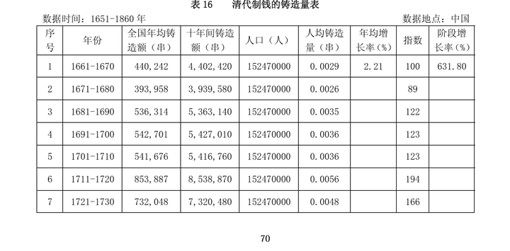 而在明朝之后,清朝仅从 1653 年到 1660 年共铸造铜钱 1298.2 万贯,1661 年到 1860 年共铸造铜钱 74 亿 1272.9 万串,这还没有算入 1652 年之前铸造的顺治朝制钱,以及没有把 1861 年之后的同治、光绪、宣统三朝制钱算在内。