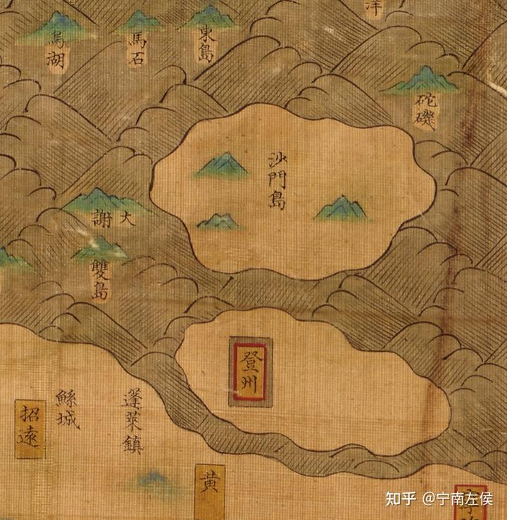 山东与辽东,同一个地名在两张图里写的名字居然不一样。山东登州府北的渤海海峡里有一个小岛叫沙门岛,就是宋朝经常用来流防犯人的那个岛。
