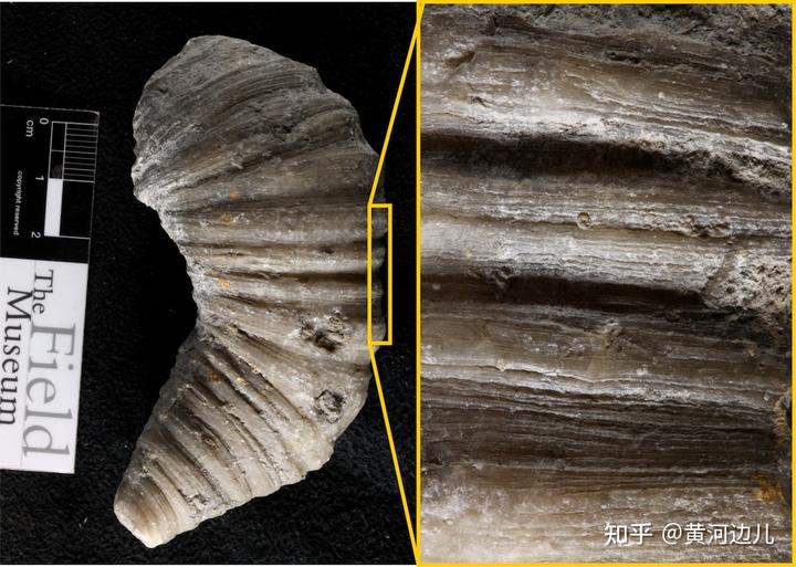 珊瑚每天都会在其碳酸钙骨骼上留下一条细微的生长脊线,每年随着季节变化还形成一条较粗的年生长环。如下图[7]。
