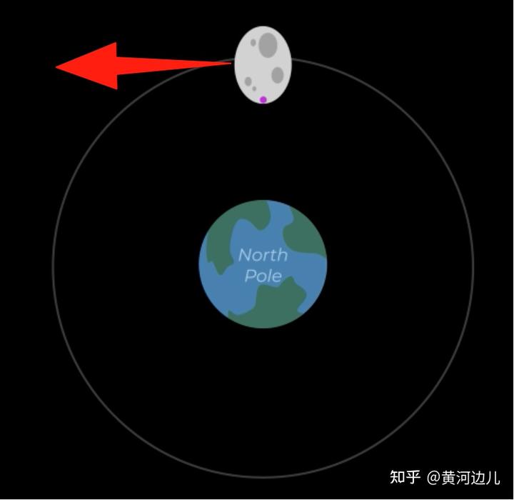 这对引力作用产生两个结果:一方面,由于海水与海床摩擦等效应,地球自转被微弱地拖慢,即所谓潮汐摩擦效应[3];另一方面,地球对月球的引力作用在潮汐隆起的牵引下给予月球一个沿轨道前进方向的推力,如下图。这个推力使月球获得了额外的轨道能量和角动量,从而爬升到更高更远的轨道上,也就是逐渐远离地球。