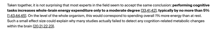 基于 PET/ fMRI/ 氧代谢测量等研究发现,人们在做高强度脑力劳动(做数学题、下棋、编程)时,一整个大脑的局部消耗只提升了 5%。