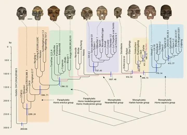 从左到右:直立人并系、智人祖先旁系、尼安德特人支、哈尔滨龙人支、智人支