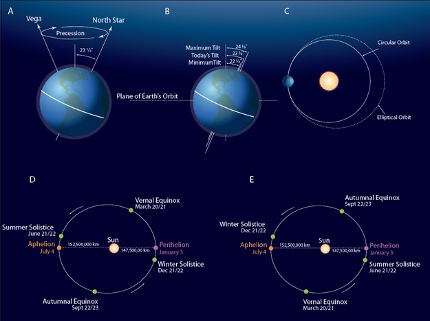 米兰科维奇周期:地球公转轨道形状在近圆(偏心率约 0.005)与椭圆(约 0.06)之间的周期性变化。