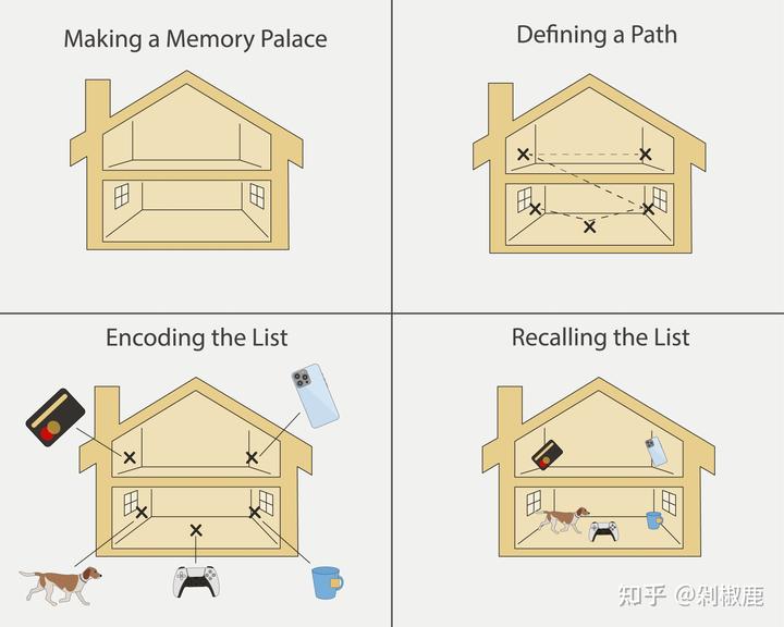 利用空间 + 视觉 + 故事,把抽象信息变成容易记的场景,极其适合记词汇、序列、演讲要点等。
