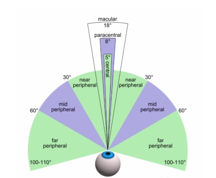 双目视觉范围大概是 120°,而左右眼单目视觉加起来大概是 220°( 有部分盲区)。