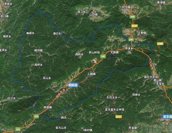 铜鼓县卫星图,潮湿的南方丛林山区。