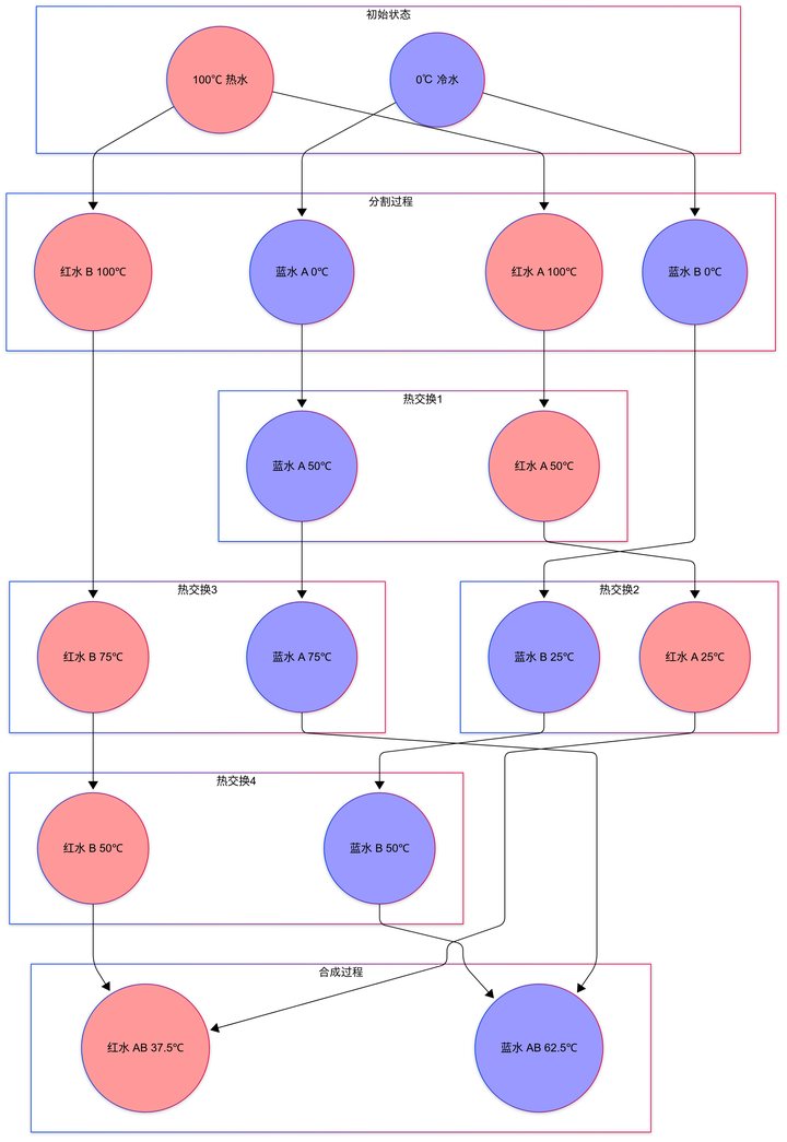 我们可以这样做, 把 100℃ 热水分成两杯红水, 0℃ 冷水都分成两杯蓝水