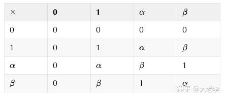 克莱因四元域是四个元素构成的集合,其中有加法和乘法两种运算,运算规则如下: