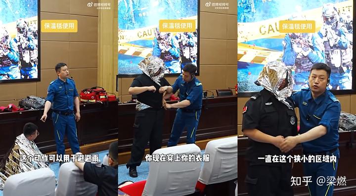 保温毯的正确使用,是塞到衣服里边,紧贴身体,才能反射身体的热量:
