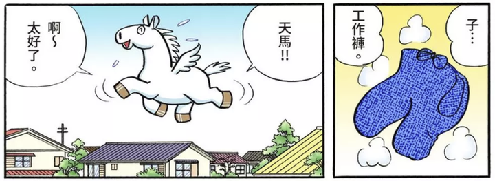接下来,野比在静子家门口等得太久了,又要变成别的东西之后再变成天马,他是这么变的:
