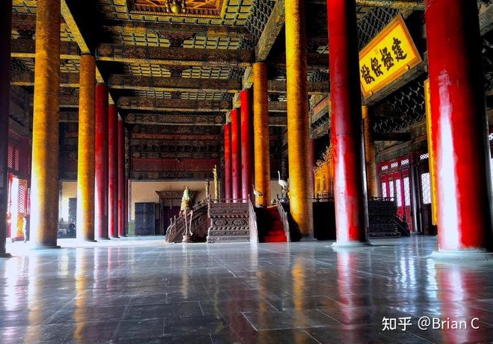 这是紫禁城太和殿,修建时间远晚于以上两个建筑,可以很直观的看到上面两个西方建筑,因为采用了木桁架,锤梁桁等“混合结构”,即便都是木质屋顶,跨度也远大于采用了“单一框架结构”太和殿。