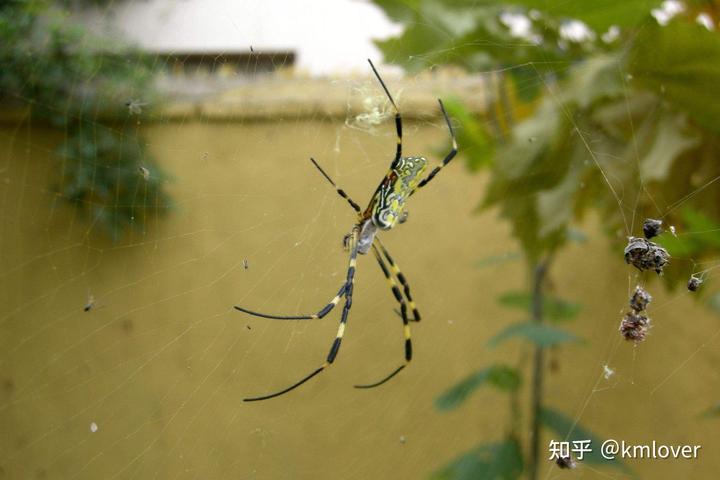 但大部分圆网蜘蛛还是出于能省则省的原则而选择了“做减法”,也就是在圆网中心(蜘蛛只要上网,一般都呆在这)周围留出一圈 free zone。一旦有敌人从背后接近,便立刻穿过 free zone 来到网的另一侧,借助蛛网来阻挡敌人。这一习性在园蛛科金蛛属的蜘蛛中表现最为明显,特别在它们还小的时候,穿越 free zone 的速度快到人眼根本无法看清,以至于有“闪烁”之感。下面视频中这只金蛛已经长得比较大,所以穿越的速度也慢了很多:
