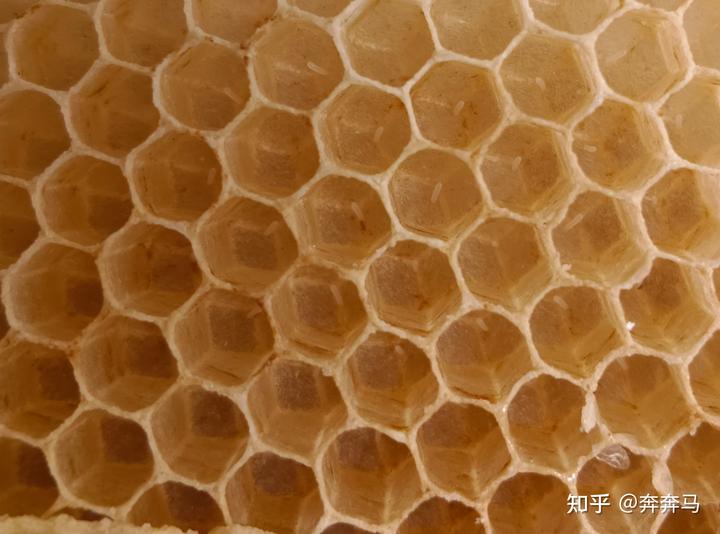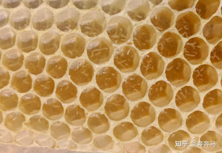 约 6 小时后,蜂巢内便会开始出现急造王台,也就是工蜂会将一些 3 日龄以内的小幼虫房扩大,改造成房口斜向下的王台,开始培育新蜂王。