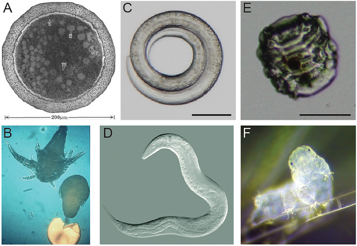 - 线虫动物门——秀丽隐杆线虫,耐久型幼虫阶段可脱水 98%[6],可在极端干燥环境存活 4 个月。