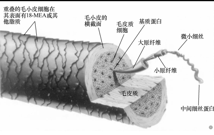 表面有众多毛小皮细胞组成的鳞片层,沿发梢呈单向排列,由角质层构成。