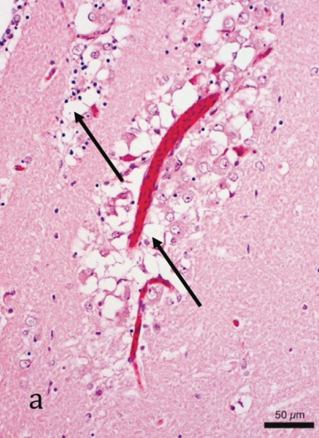 之后,每年冬天还在出现新的病例。1998 年,生物学家经过大量的工作发现,患病的白头鹰和美洲骨顶的共同症状是脑部视顶盖和小脑的髓鞘内水肿,称为海绵状髓鞘病变(spongiform myelinopathy),之后又命名为鸟类空泡状髓鞘病变(avian vacuolar myelinopathy,简称AVM)。这种神经损伤过去没有发现过。很多看起来正常的美洲骨顶解剖后也发现了这种损伤,说明就算没有明显症状,也有可能已经患病