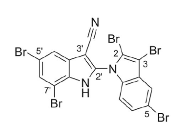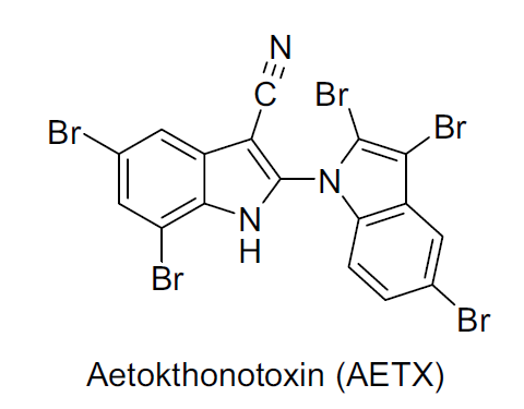 这是个新化合物,一个分子有 5 个溴原子,这也解释了为什么实验室培养的蓝藻没毒。因为培养基根本没有溴元素。然后在培养基中加了溴化钾之后果然发现培养的蓝藻产生了这个毒素。这个毒素产量很低,不过培养温度从 28℃降到 21℃、培养转速变高(剪切应力增大)等环境压力可以让产量上升一百倍以上。经过分离纯化之后,一系列光谱技术确定了这个化合物的结构,取名为杀鹰毒素(aetokthonotoxin)。杀鹰毒素的结构主要是两个吲哚环,上面有 5 个溴原子和 1 个氰基。