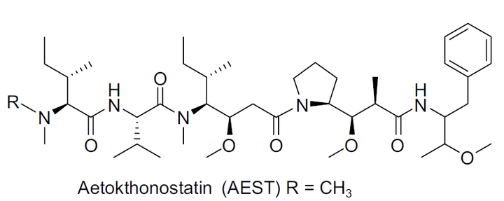 第 2、3 个问题可能永远也不会知道了。不仅如此,后续研究反而带来了新的问题。因为这种蓝藻不仅产生杀鹰毒素这一种毒素,还会产生杀鹰抑素(aetokthonostatin)。杀鹰抑素是海兔毒素(dolastatin)的类似物,可以结合微管蛋白,破坏微管动态平衡,从而产生比杀鹰毒素更强的细胞毒性。那么杀鹰抑素和 AVM 的关系又是新的问题。