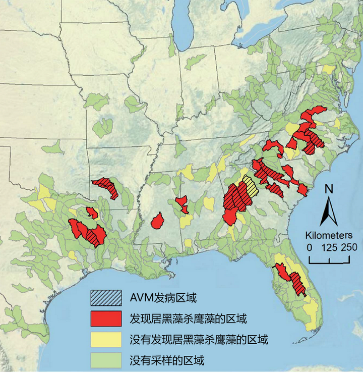 南卡罗莱纳州和佐治亚州交界处的瑟蒙德湖,白头鹰、加拿大黑雁(Branta canadensis)、双领鸻(Charadrius vociferus)和美洲雕鸮(Bubo virginianus,又称大雕鸮、大角猫头鹰)先后确诊了 AVM。1998~2004 年瑟蒙德湖发生了 1994 年以来最大规模的白头鹰死亡事件。同期监测发现 17~94%的绿头鸭有 AVM。但是,浣熊、海狸和灰狐这些哺乳动物都没有 AVM。