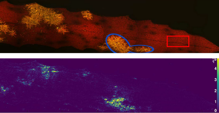 上图是黑藻叶片显微照片,红框没有居黑藻杀鹰藻,蓝圈有居黑藻杀鹰藻。下图是对应的 C17H6Br5N3 化合物质谱成像图。质谱信号区域和居黑藻杀鹰藻生长区域对应得很好