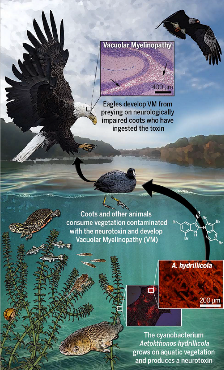 综合上面这些研究成果,生物学家于是有了初步猜想:可能是某种天然的、在特定时间地点才会产生的毒素导致了 AVM。而白头鹰因为吃了患 AVM 的美洲骨顶才患上 AVM。很明显那些神经损伤的美洲骨顶更容易被白头鹰捕获,这增大了白头鹰患病风险。而且白头鹰会食腐,大量死于 AVM 的美洲骨顶尸体也会导致白头鹰摄入那种毒素。也就是说,这种病可能是通过食物链传播的