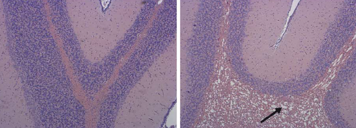 为了验证这个猜想,生物学家给另一种猛禽红尾鵟(Buteo jamaicensis)喂食美洲骨顶,毕竟白头鹰是美国国鸟数量有限不方便做实验。其中 5 只红尾鵟吃患有 AVM 的美洲骨顶,1 只吃健康的美洲骨顶。29 天后所有红尾鵟看上去都正常,但是处死、解剖、镜检发现,吃了患 AVM 美洲骨顶的红尾鵟出现了 AVM 典型的脑部损伤,而吃健康骨顶的红尾鵟则脑组织正常。这证实了食物链传播的猜想。也就是说,植食和杂食的水鸟先摄入了毒素然后发病,猛禽捕食水鸟导致发病。