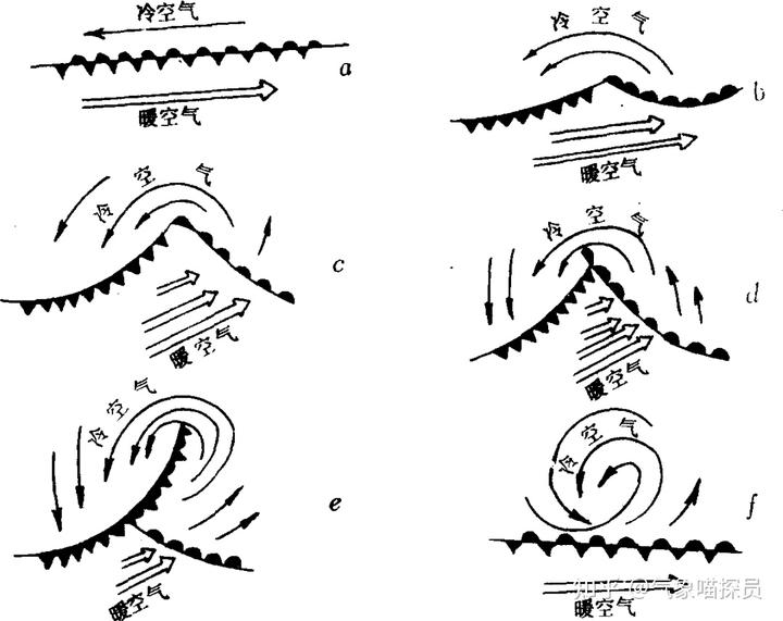 生命的起点,是锋面上出现一个微小的波动。这个波动之所以关键是因为它打破了锋面的平衡,创造了一个高效的能量转化通道。在波动形成之前,其两侧巨大的温度梯度就像是一个满水的水库,缺乏释放的途径。波动的出现,使得冷空气开始从一侧绕流暖空气,从另一侧绕流形成一个初步的循环。这个循环如同接通了电池的正负极,开始了缓慢的充电过程。