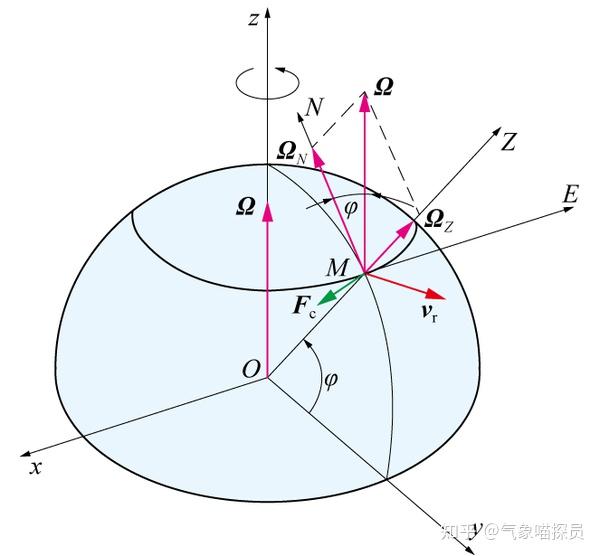 其次是动力因素,这就来源于地球的自转——科里奥利力。正是这一因素,将简单的南北向热力环流,扭转成我们最为常见的东西向主导风带。地球自西向东旋转,其产生的科氏力使得运动的物体在北半球向右偏转,在南半球向左偏转。当那股从赤道高空流向极地的气流持续受到科氏力的作用时,它前进的方向就会不断的偏移。最终当它运行到南北纬 30~60 度附近的中纬度地区时,原本南北向流动已经完全偏移成近乎自西向东的方向