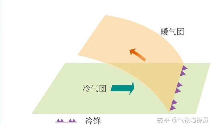 冷锋,是冷气团主动向暖气团一侧推进的锋。在天气图上,它用蓝色三角形符号标示,由于冷空气的密度大且推进迅猛,它迫使暖空气剧烈而快速的抬升。因此,冷锋过境时往往伴随线状的积雨带,带来短时狂风大骤雨、雷暴、冰雹甚至是龙卷等强对流天气。锋线一过,气温徒降、气压骤升,天气迅速转晴。其天气过程可谓是“疾风骤雨,速战速决”。