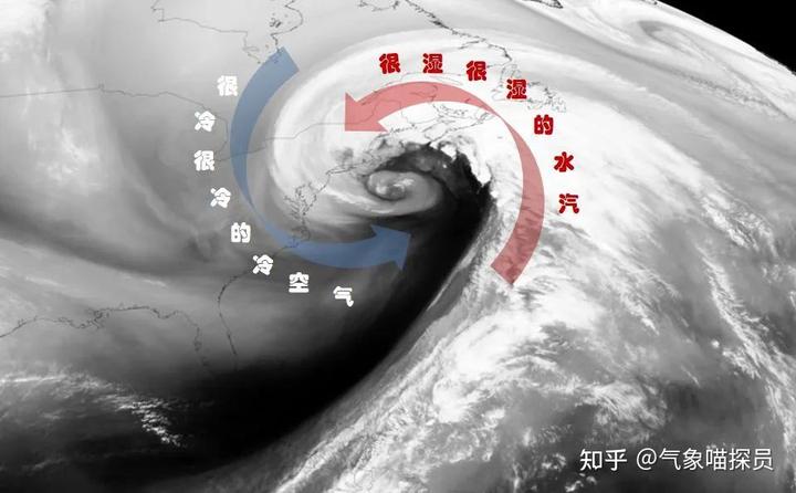 炸弹气旋也是温带气旋的一种,但它是温带气旋发展的极致,是自然之力最为狂暴的展现之一,也是西风带野性的终极体现。其核心在于极端的能量供给和高效的动力条件相结合,导致气旋的爆炸式深化,由于它炸弹式的增强所以被称之为炸弹气旋。