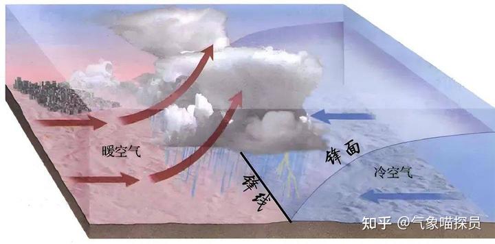 当两个属性不同的气团相遇时,他们并不会轻易混合,而是会在其交界处形成一个狭窄陡峭的过渡区域,这个区域就是锋,这个过程被称之为锋生,你可以将锋想象成冷暖气流交汇大战的场地。由于冷暖空气的密度不同,较重的冷空气会像楔子一样潜入较轻的暖空气下方,迫使暖空气沿着锋面斜坡大规模的抬升。正是这种有组织的、大规模的抬升运动,构成了风雨天气的直接动力。
