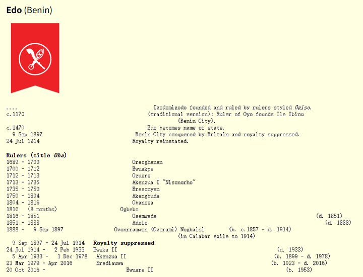 贝宁王国是近代早期尼日利亚南部沿海的强大王国,1897 年被英国征服,1914 年在英国宗主权(1960 年后是尼日利亚宗主权)下复国至今