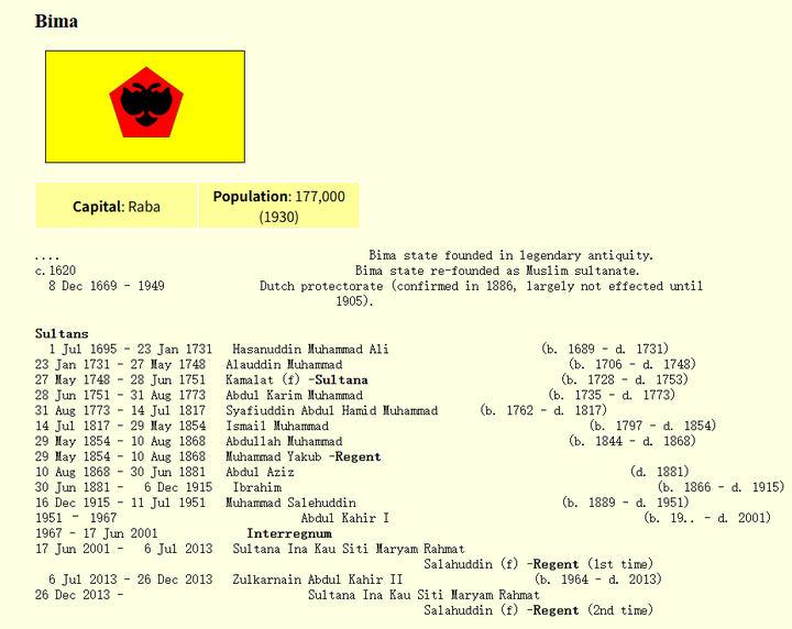 这只是尼日利亚的非完整名录,可以想见,在非洲还有多少这样的非主权小王国。非洲以外,印度尼西亚和东帝汶也有极为众多的小王国。上面那个网站列出了印尼境内的二三百个小国,其中有些国家,熟悉印尼历史的可能会有所了解,比如这个比马苏丹国,是小巽他群岛上一个比较强大的王国