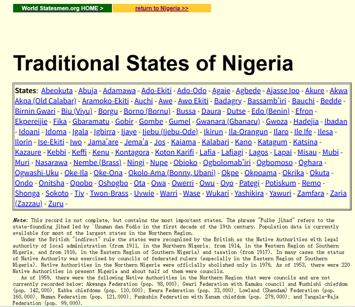 然而这些也只是非主权君主国的冰山一角,以上列举的都是其中影响很大的,因此才能成为主权国家的一级行政区划。除此之外还有海量的不构成行政区划的小王国、酋长国。比如有个网站收录了尼日利亚传统国家(traditional states)也就是非主权君主国中的一部分,已经有 100 个左右