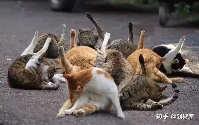 但是比如猫,虽然算是独居动物,但是在一个资源相对比较丰富的地区,猫咪之间也可以发展处半群居的社交,聚在一起像开会一样: