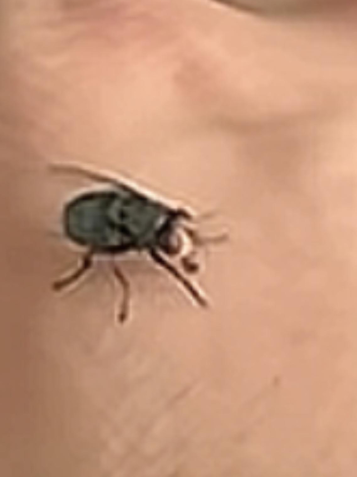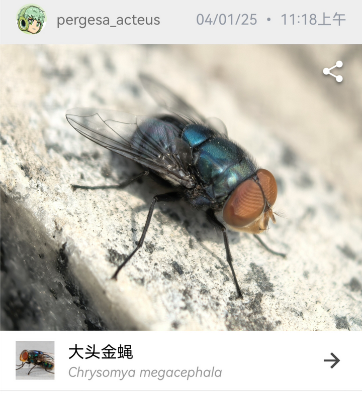 例如这个去环球影城的视频,最开始出现的是一只复眼巨大、在头顶相接的丽蝇。它可能是 大头金蝇 Chrysomya megacephala 或近似物种的雄虫。